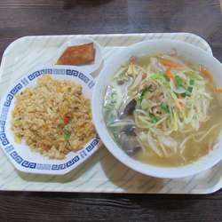 半チャーハンは、塩気が控えめで、ややぼやけた感じ。少しパサついた食感。油は気にならないレベル。具は、刻み葱。玉子。チャーシューに加え、グリーンピースとコーンがあったのは彩的にも嬉しい。