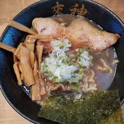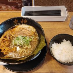 気さくなスタッフ、真ん中に一人席の島と4人がけ・6人がけのテーブルで、感じの良い店内です。壁に花等で雷神を象った飾りが面白い。スープは煮干しでじっくり取った感じですが、煮干し臭さはなく、美味しいです。太麺とのコラボ良いですね。厚みのある叉焼も臭みなく柔らかい。味玉は普通ですが、最後まで飽きることがない美味しいラーメンでした。