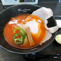 真っ赤なスープのらーめんは一見すると辛いらーめんに見えます。スープはトマトベースのものでメニュー名通りナポリタンのようです。トマトの旨味がよく出ているもので濃度は意外にも高くなくなかなかです。トマトの甘味がやや強く酸味は控えめな印象のスープになっています。濃度が高くないためしつこさはなくトマトのクセもなく食べやすいです。