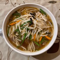 具は、もやし・にんじん・にら・キクラゲ・豚肉。キクラゲは細切りタイプで、サンマー麺として出会うのは珍しい。野菜がたっぷり入るのは嬉しい。