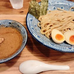 「二郎つけ麺」ということで、別皿で二郎風の野菜がついてくる。ただ、味のほうは王道の豚骨魚介つけ麺。全粒粉の太麺と濃厚な豚骨魚介のつけ汁で、ぐいぐい箸が進む。途中、二郎野菜をはちょっとした味変にはなるが、ノーマルで十分満足できる一杯。