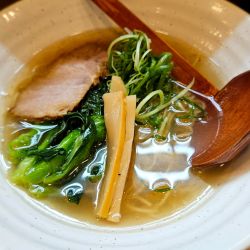 一口目から厚みのあるコクが広がる。鶏ベースに魚介も加えているのだろうか。複層的な厚みがあり、塩角は立ち気味でシャープな輪郭を与えつつも、しょっぱいということはない。表面の香味油による軽いまったりさも旨味の余韻を残す一助に... 続きを見る