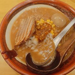 スープはコクがあって甘さを感じるマイルドなもの。玉ねぎがいい仕事してる。麺はウェーブがかかった黄色い中太麺で、これぞ味噌ラーメンというもの。チャーシューはほろほろ。チェーン店でもこのレベルのラーメンが食べられるなら満足。ただ、以前は無料トッピングだった背脂が有料になったのがなー。
