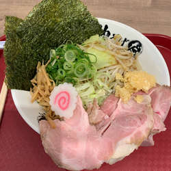 チャーシュー4枚、メンマ、青ネギ、キャベツ、もやし、海苔がトッピングされております。