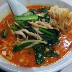 豚レバー入り激辛タンメン(980円)を。スープは、何ベースなのだろう。なかなかオイリーで、かなり刺激的な辛さ。変なクセはなく、食べやすい。麺は、ストレート細麺。かなりの柔茹で。これは惜しいです。具は、小ねぎ・ピーマン・小松菜・レバー・しめじ。レバー・しめじも美味だが、アクセントになっている刻み生姜が良い仕事をしている。接客、好印象なのもポイント高いです。