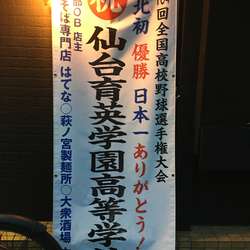 店の外には㊗仙台育英学園高等学校の垂幕がかかっている。社長が野球部OBだそうで優勝記念でワンコインサービスをやっていたようだが逃してしまった。