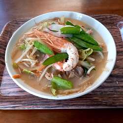 大手チェーン店に近い味のスープにピッタリのつるつる麺と、豚肉・かまぼこに沢山の種類の野菜をたっぷり使用。一番上には大きな海老もトッピングされ充実の一杯です。