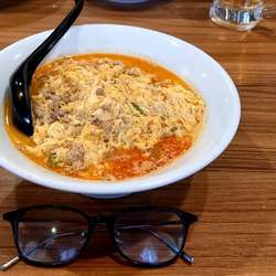迷わず麺をと大好きな玉子入りのこちらを注文。ピリ辛でありながらひき肉とふわふわ玉子の旨味が凝縮した出汁。