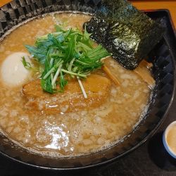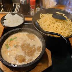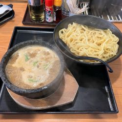 平日12時少し前、空席多数。一般的なつけ麺ですが、見た目より薄味で魚粉などが欲しい。石焼なのでスープは冷めにくい。割りスープはポットが置いてあります。