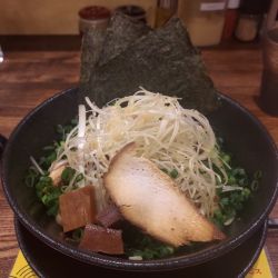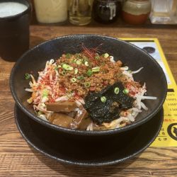 地下のお店に入店し、カウンター席に着席する。各テーブルにメニューが置いてあり、左上の人気品定番位置に写真がある煮干し油そば(並盛)を注文した。並盛は麺量150g、中盛が225g、大... 続きを見る