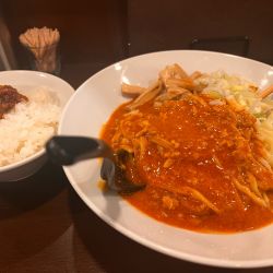 麺は加水の高い平打ち太麺、ムチムチの力強い弾力で濃いめの味付けに負けておらずバランス良好。