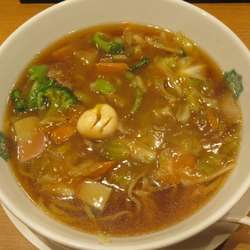 尖りのない穏やかな醤油スープで、ほの甘さが感じられる。餡も味濃すぎないので、全体として食べやすい味わい。とろみの強さは中程度で、餡の量は表面の7割を覆う感じ。