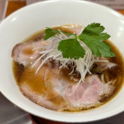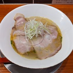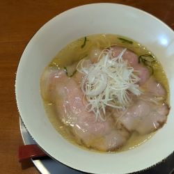 あす流ゆずり、旨い出汁にジャストな塩味、クリアな美味しさのスープ。弾力、伸縮性抜群の透明かかった麺。レア気味チャーシュー、白髪ネギと極薄スライス玉ねぎ、若干の刻み大葉、シンプルで美味い。車は3時間無料のイオンスタイル新茨木へ。