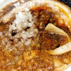 いわゆる背脂チャッチャ系のらーめんでますたにラーメンっぽいです。動物ベースのスープは濃度は低くサラッとしている中に背脂の甘味が感じられます。思った以上にベースのスープがさっぱりしていて少し物足りないです。
