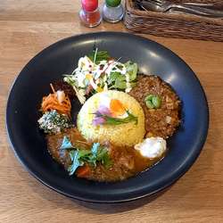 週ごとにメニューが替わるそうで、今日は週替りの「筍とエリンギのキーマカレー」と日替りの「厚揚げと根菜のスパイスカレー」のあいがけをいただきました。カレーはそんなに辛くはありませんが、旬の素材が生きており大満足でした。