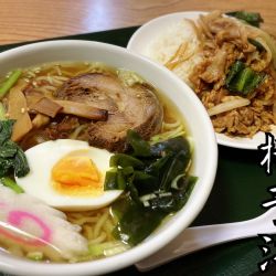 兼ねてより宿題にしていた町中華、達筆なメニュー短冊が刺さるぅ〜♪に初訪にて、オリジナル麺の「揚子江ラーメン」のつもりでしたが、戦場の様な満席の店内雰囲気と激アツ店内温度にヒヨって、滞在時間短縮の為に他者と併せて「ランチ(半ヤキニク飯+半ラーメン)¥700」ぉ。