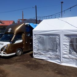 ・店の外観:白いビニールシートのテント、金色っぽいキッチンカー。