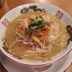 しばらく待ってラーメンとごはんが提供される。麺は長方形型断面の中太ちぢれ麺。トッピングは味玉1/2×2、千切りネギ、刻み小ネギ、... 続きを見る