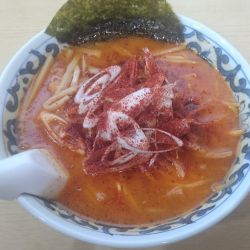 掲題を口頭発注。10分弱ほどで着丼。味噌らーめんに一味をぶっかけた様なビジュアル。まずはスープをひと口。ややシャバ系ですが味噌の風味やコクは強め。一味も見た目ほど辛さはなくいい塩梅。麺は黄色系ウェービーで味噌では王道な装い。チャーシューは写メでは見えにくいですが、一口大のコロチャーで崩れる柔らかさで味もしみておりグッド。