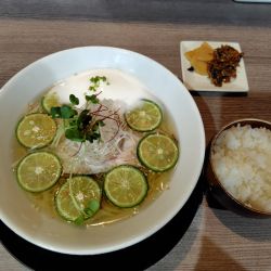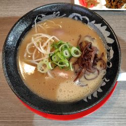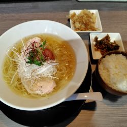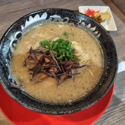 豚肩レアチャーシュー、青ネギ、細もやし、きくらげ、別皿(白菜浅漬け、からし高菜、)