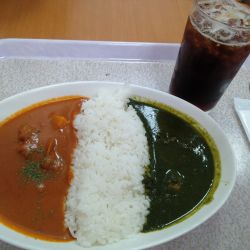 カレー2種盛の食券を購入し、バターチキン、ほうれん草、辛さ普通でお願いしました