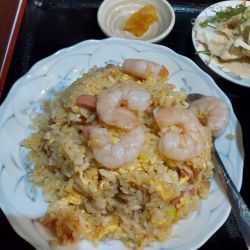 海老炒飯はエビが五匹乗ったチャーハン、で味は淡白で、