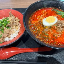 トラジのユッケジャンスープに麺入れましたの味😋なかなか美味い😋焼肉丼は間違い無し。SAのフードコートではかなり満足🍜