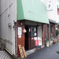 ・店の外観:そっけない外観、板地に黒色文字の地面に置かれた看板、メニューの立て看板。
