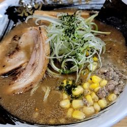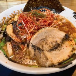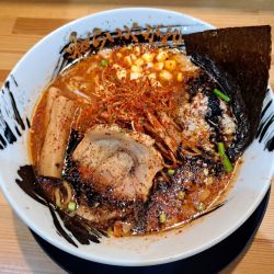 背脂の浮いたラーメンです。にんにくの香りも背徳感。