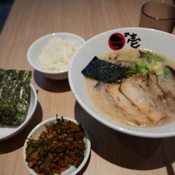 食べたのは、純豚骨 粉落とし+替え玉 粉落とし+サービスライス+サービス餃子 800円。