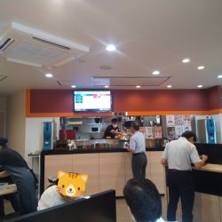 14:00頃訪問。この時間でも程好い客入り。店内は割と小ぢんまりとしており、座席と立ち食いカウンターが設けられている。簡素な内装だが、居心地は悪くない。男女数名の店員さんによる切り盛り。