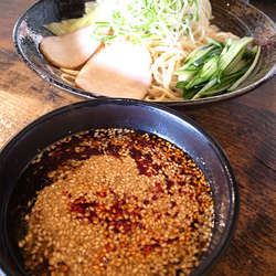 濃厚な醤油ベースのつけ汁に辛味のソースが浮かび、細麺や野菜とともにいただくと美味しい一品でした。