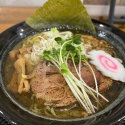 揚げニンニクスライスがのったニンニクの風味が香る黒ラーメン🧄スープは鶏ガラと豚骨に鶏油を合わせた塩タレで飲み干すスープ👌大判の焼豚は厚みもあり嬉しいです🍖下味がもう少しついてるともっと良かった🌱麺は町中華のような細縮れ中華麺でどこか懐かしい味🍜全体的に優しい味わいの中にニンニクの風味を合わせた美味しいラーメンでした🌈