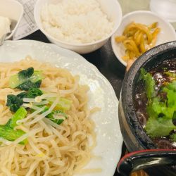 かん水の匂いを感じる平べったい形状の中細麺、加水率はちょい高めなタイプでモチムニな食感。麺の形状ゆえか、後述する麻婆の持ち上げ/絡みは中々のもの。麺量は300gちょいか。