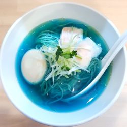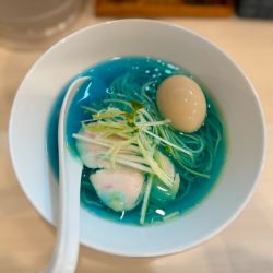 細麺を持ち上げてみても青いスープがからまってなんとも衝撃的な見た目。