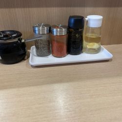 卓上には、にんにく酢、カエシ、一味、ブラックペッパーと黒壺に刻みにんにくがあります。セルフですね。