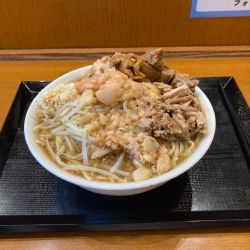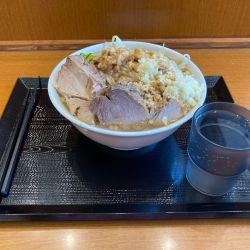 ニンニクマシマシ、野菜ふつう、アブラマシ。ブタはふた切れ。麺は200くらいと思う。麺も味付けも野菜もブタも全部うまい。割り箸もっと太くして。あと胡椒と一味も置いてほしい。