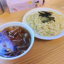 冷水で締めた中縮れ麺にはちぎった海苔が乗っています。暑い梅雨にもぴったりな一杯です。