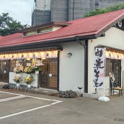 ・店の外観:和風な建物、白色地に黒色文字の看板、軒下の電球群・白色の暖簾。