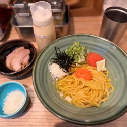 油そばとあるが、油脂感低く、釜玉そばといったほうがより正確かも。そのため、比較的すっきりした味わいでタレ自体の旨味も強くなく、トッピされた鰹節の風味の方が前に出ている感じ。卵黄の濃厚な風味がわれて加わりいい感じ。後... 続きを見る