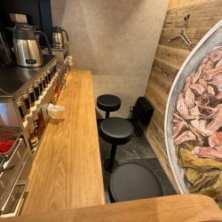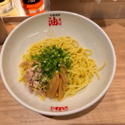 店内はグレー基調のオシャレな、今日現在下に浅い棚のある厨房向き変形コの字カウンター16席のみでお水.デドックスウォーター.黒烏龍茶、ジャスミン茶は奥にあるドリンクコーナーにてセルフ(壁側にハンガ➖掛け、折り畳み式荷物カゴは出して頂き入って左側にお手洗いあり)。