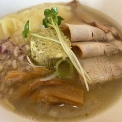 初訪問のお店、冷やし中華が無かったので特製塩ラーメンを注文、少し待って着丼、チャーシューをサービスして貰いました、スープは塩の旨味を感じ、上に乗ったアオサバターを溶かすとコクがでて良い感じ、卓上に有るレモンを入れると味変して楽しめます、麺はちょっと縮れた細麺で、チャーシューは豚バラでした、スープは良いんですけど、なんか…欲をいえば麺はストレート細麺でチャーシューが低温ロースなら... 続きを見る