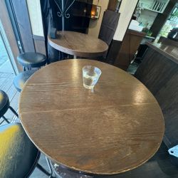 店内はお酒が並ぶまんまBARの、今日現在厨房向きカウンター4席と4人掛けテーブル席が2卓、2人掛け丸テーブル席が5卓ありお水はカウンター手前の冷水タンクにてセルフ(入口にハンガーポール、左奥にお手洗いあり)。