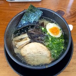 トッピングは大判チャーシューにメンマ・ねぎ・キクラゲ・煮卵1/2・海苔に白ごまがふってあります。