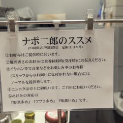 | 備考 | 暖簾を変えて釜玉中華そば ナポレオン軒の二毛作深夜営業開始。 二郎系の釜玉中華そば「釜二郎」を提供。 自家製麺の釜玉中華そば ナポレオン軒とは違い、 ナポ二郎ではカネジン食品による オーションを配合した特注麺を使用。 麺量は並盛200g・大盛300g。 また釜玉中華そば ナポレオン軒のような 〆のスープ割りはやってない。 都立大のナポレオン軒は1号店ということで 旗艦店という位置付けだと思いますが、 このナポ二郎は人員不足もあって 今後他支店での提供予定はない模様。 ナポ二郎のススメ ①お好みはご提供時に伺います。 ②麺の固さのお好みは食券回収時にお伝えください。 ③イヤホン等でスタッフのお伺いに 気付かれない場合はノーマルを提供。 ④ニンニクは卓上の御座います(その他に生姜・ラー油・胡椒)。 ⑤お好みの対応は『野菜多め』『アブラ多め』『味濃いめ』です。 |