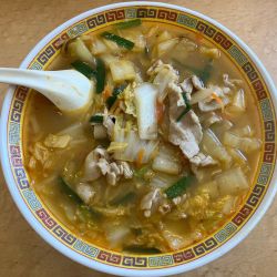 あっさりめの出汁に、醤油、ピリ辛、軽い酸味と言った感じのスープ。そこに豚肉、白菜、ニラ等の炒めがのり、中細ストレートの麺が入ります。