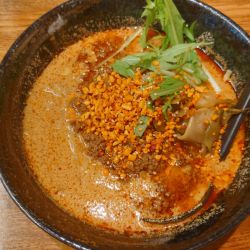 やっぱりこのごまとナッツの香ばしくて満足感のあるスープがたまらないっすね。あっつあつながら良い感じの茹で加減の中細やや縮れ麺と絡んでこれがたまらん。半ライスいこうとしましたが、今回は連れとともに自重。