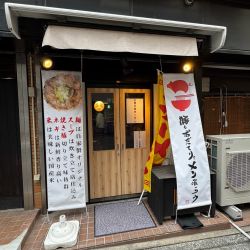 ・店の外観:白色地に黒色文字の垂れ幕看板、メニューの垂れ幕。