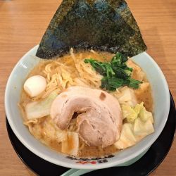 麺顔は海苔が3枚乗り、キャベツにチャーシュー・ほうれん草・ウズラの卵・下の方に少量のモヤシ。