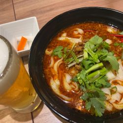 QRコード読み取りで注文するのだが、入り口に貼ってあった生ビールセットがそこにないもんで訊いてみたらNoイメージのよくわからんやつから注文するらしい。このセットは担々麺か麻辣麺からしか選べない。まあ、通常980円だからビールが20円ってことか。それに惣菜付き。